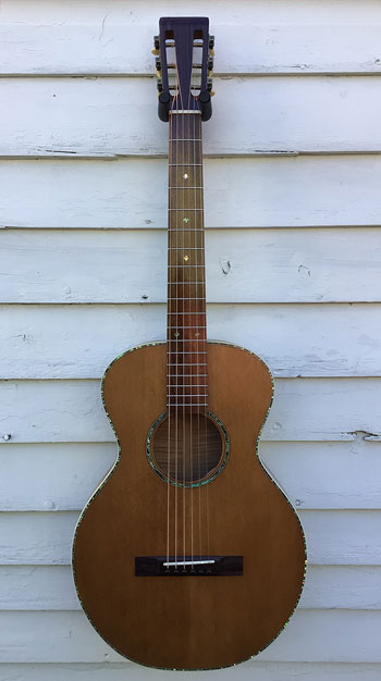 Shop-built L-0 style 0-size 12-fret in X-braced solid cedar/solid maple, 1 3/4” nut, 2 5/16” string spacing, beautiful parlor proportions, rich voice and great all around finger styler
