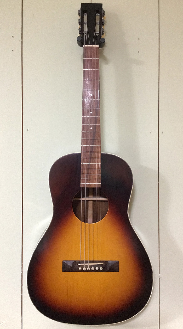 Shopbuilt Martin inspired 00-size, 12-fret in X braced spruce over Pau Ferro rosewood. Nut 1 3/4”, String spacing 2 1/4”. Bluesy-inspired relic burst finish with classic styling and reliable tone