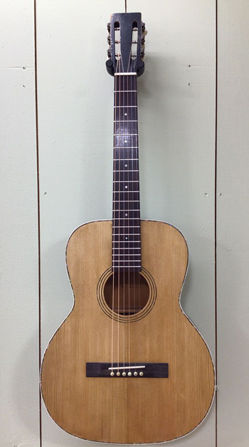 Regal built stout guitar models at affordable prices for young followers of early radio personalities. The “Buck Jones” model was one of many stenciled cowboy guitars sold in 1930s department stores. With a few modern upgrades (and despite the lower bout of only 12” across) I’m pleased to offer this sweet sounding, easy playing, small body steel string for your consideration. A great little fingerstyle guitar, plain and simple.