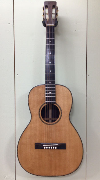 I don’t generally veer too far from established design norms on a small body build but decided to throw fate to the wind on this beauty. This Martin-inspired 12-fret delivers the classic body proportions and styling so recognizable to pre-war design lovers, but on steroids. Particularly, the extra body depth exceeded tonal expectations and the neck depth and profile are not for the faint of heart. Huge sound for bid hands pretty much sums it up.